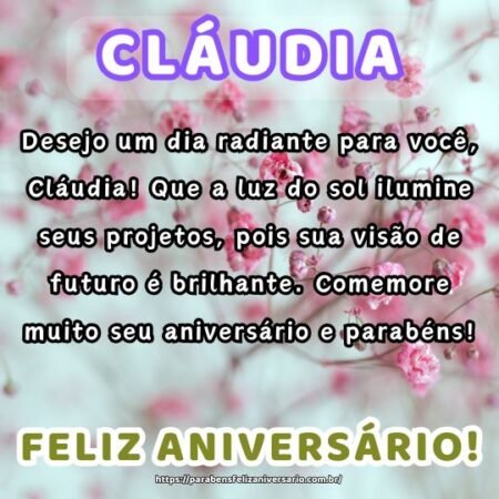 Para você, Cláudia, neste dia festivo, envio meus votos de um feliz aniversário. Que seus sonhos continuem a se realizar, pois sua perseverança inspira. Comemore muito!
